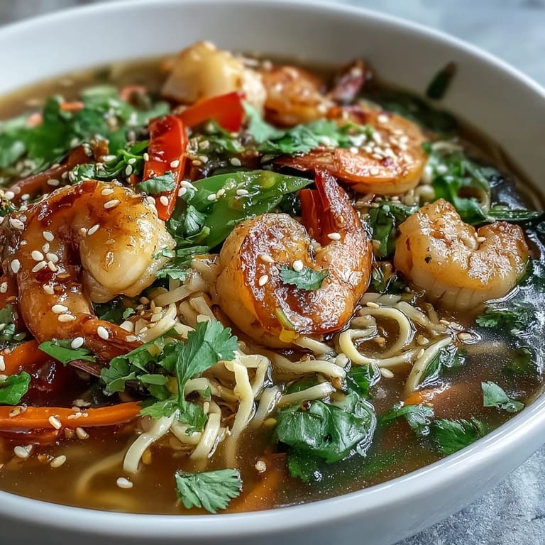 Save to Pinterest There's something about the sound of seafood hitting hot broth that signals you're about to eat something special. I discovered this noodle bowl on a rainy Tuesday when I had shrimp and scallops defrosting on the counter and suddenly craved something warm and complex. The magic isn't in any single ingredient—it's in how the broth wraps around everything, turning a simple bowl into something that tastes like you've spent hours on it when really you haven't. My kitchen filled with the smell of ginger and sesame within minutes, and I knew I'd be making this constantly.