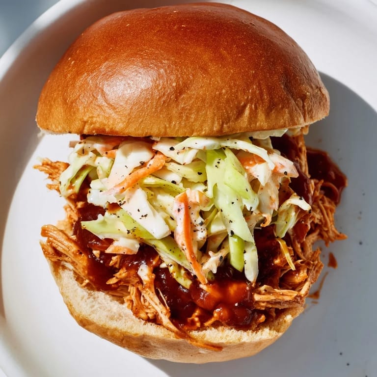 Save to Pinterest There's something about summer that makes you crave the simplest, most satisfying meals, and this BBQ chicken sandwich became my answer to those quick weeknight dinners when I wanted something that felt special without the fuss. I discovered it wasn't the fancy plating or complicated techniques that made people happy—it was the smoky sauce clinging to tender chicken, the cool crunch of slaw cutting through the richness, and the way everyone's hands got sticky in the best way possible. My neighbor actually taught me the trick of shredding the chicken with two forks while it's still warm, and it made all the difference.